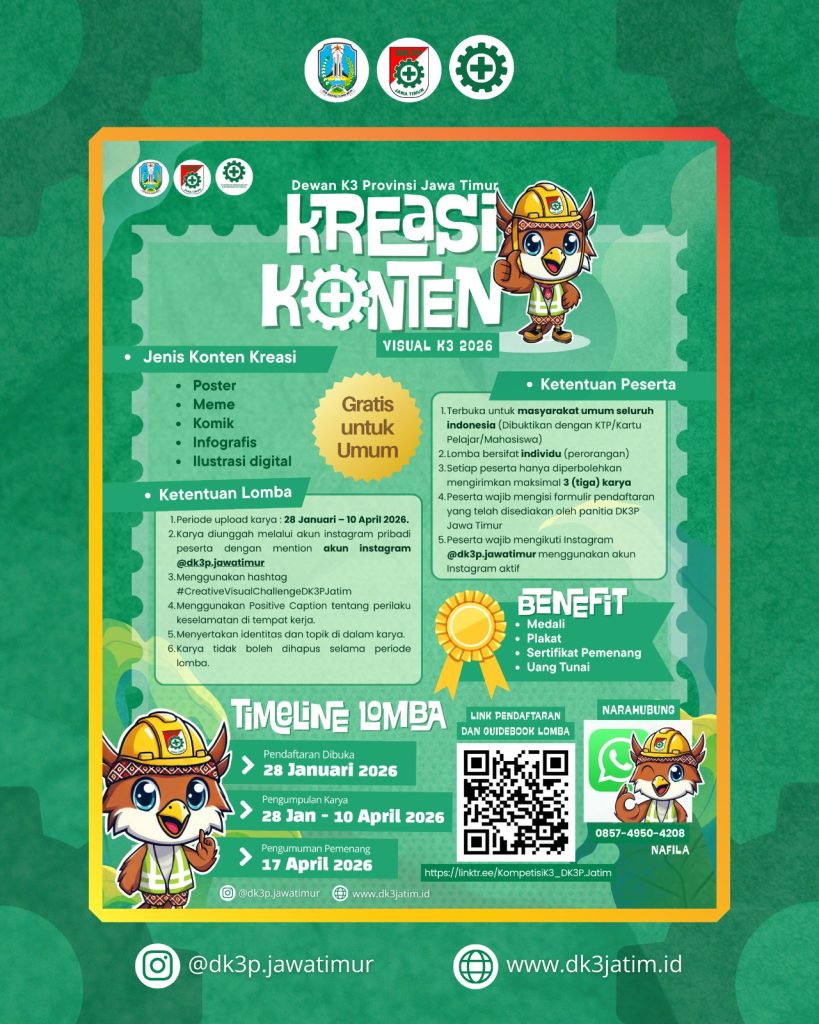 Ketentuan unggahan dilakukan melalui Instagram pribadi dengan mention @dk3p.jawatimur dan menggunakan tagar #CreativeVisualChallengeDK3Pjatim. Sama seperti kategori sebelumnya, karya harus memuat pesan positif tentang perilaku keselamatan kerja dan tidak boleh dihapus selama periode lomba. Timeline pelaksanaan dimulai 28 Januari 2026 hingga 10 April 2026, dengan pengumuman pemenang pada 17 April 2026. Kami berharap kategori ini mampu memperluas literasi K3 melalui pendekatan visual yang komunikatif dan mudah dipahami lintas generasi.
