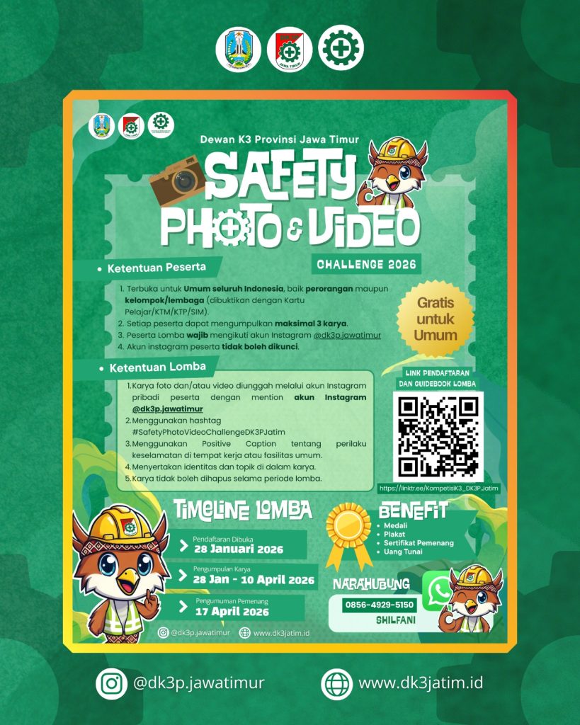 Dewan K3 Provinsi Jawa Timur (DK3P Jatim) secara resmi membuka rangkaian Lomba K3 Nasional Tahun 2026 sebagai bagian dari komitmen kami dalam memperkuat budaya keselamatan kerja di Indonesia. Tahun ini kami menghadirkan empat kategori utama, yakni Safety Photo & Video Challenge, Kreasi Konten Visual K3, serta Kompetisi Inovasi K3, yang dirancang untuk menjangkau masyarakat umum, pekerja, pelajar, mahasiswa, hingga perusahaan. Seluruh kompetisi ini kami buka secara gratis untuk umum dan dapat diikuti oleh peserta dari seluruh Indonesia.