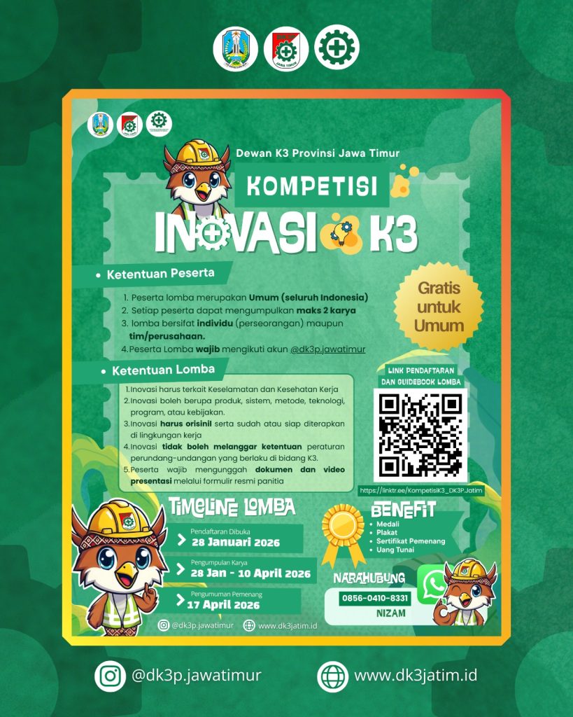 Setiap inovasi harus bersifat orisinal dan tidak melanggar ketentuan perundang-undangan di bidang K3. Peserta diwajibkan mengunggah dokumen serta video presentasi melalui formulir resmi panitia. Dengan periode pelaksanaan yang sama, yakni 28 Januari hingga 10 April 2026 dan pengumuman 17 April 2026, kami menegaskan bahwa lomba ini bukan sekadar kompetisi, melainkan gerakan kolektif untuk menumbuhkan budaya K3 yang hidup dalam kreativitas, kesadaran, dan inovasi berkelanjutan di dunia kerja Indonesia. Untuk informasi lebih lanjut. bisa mengakses kode QR pada flyer atau langsung mengakses link sebagai berikut http://https//linktr.ee/KompetisiK3_DK3PJatim.